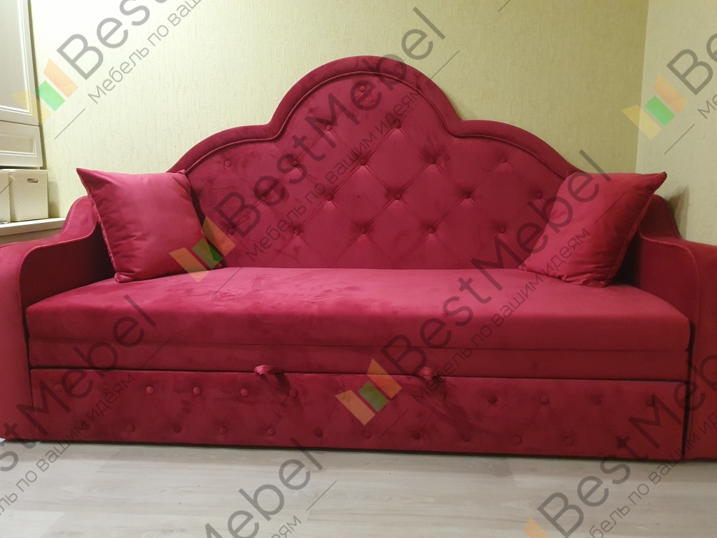 Прекрасное исполнение👍. Неожиданно, вместе с другой мебелью, заказали девочке 8ми лет, с расчетом на вырост, и остались очень довольны! Цвет ткани отдельный восторг, не красный, а красивый тёмно-розовый насышенный (велюр Италия 15). Очень рекомендую.