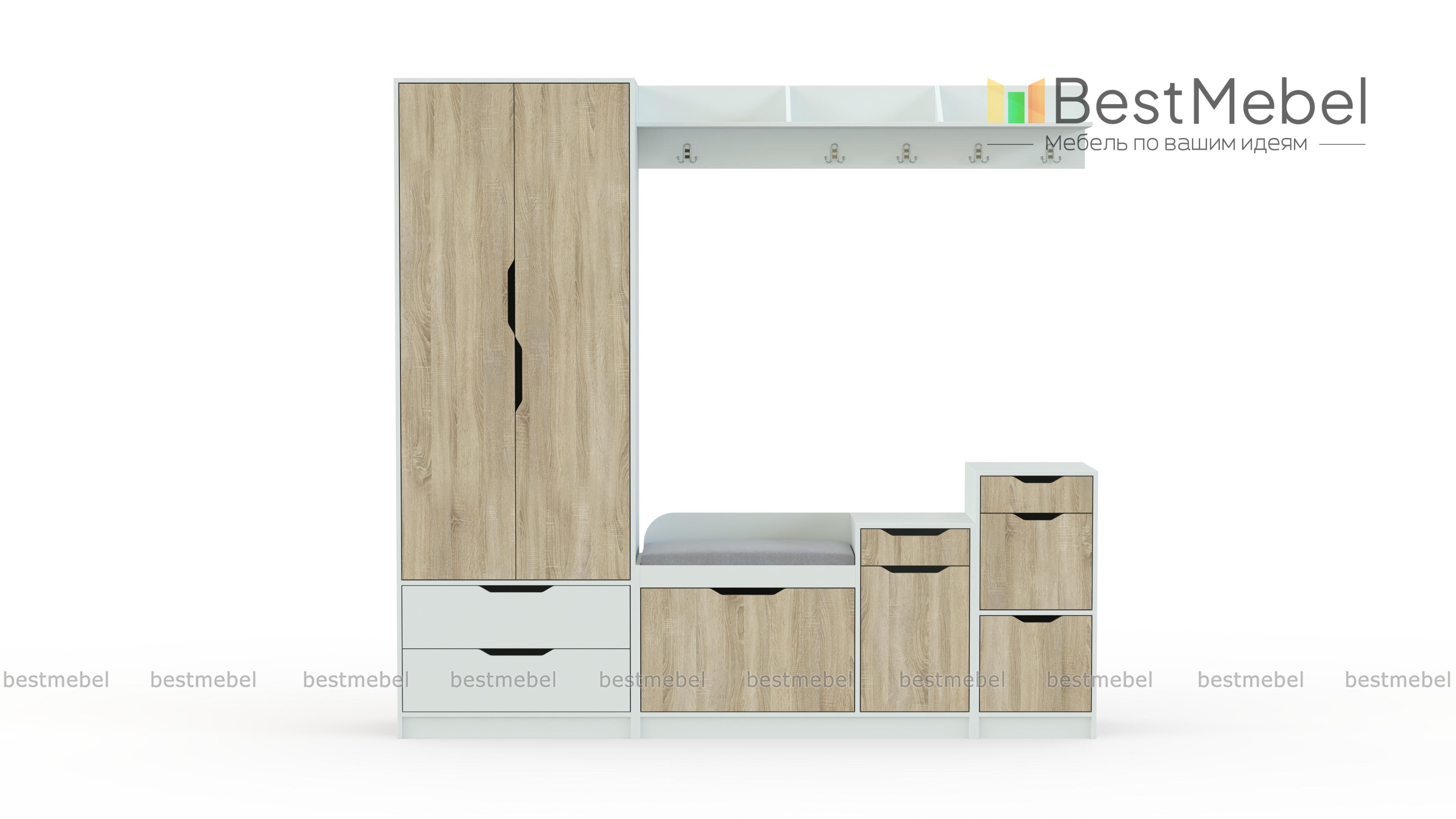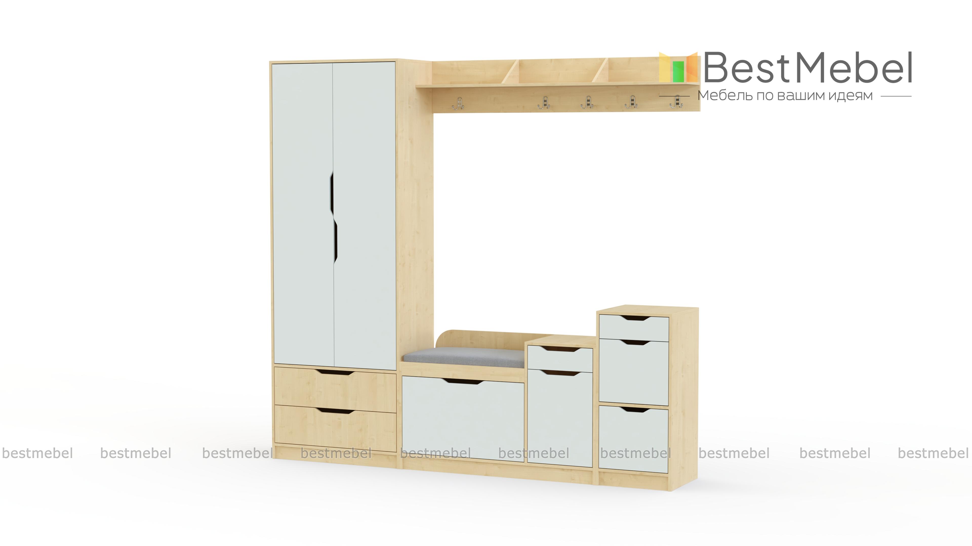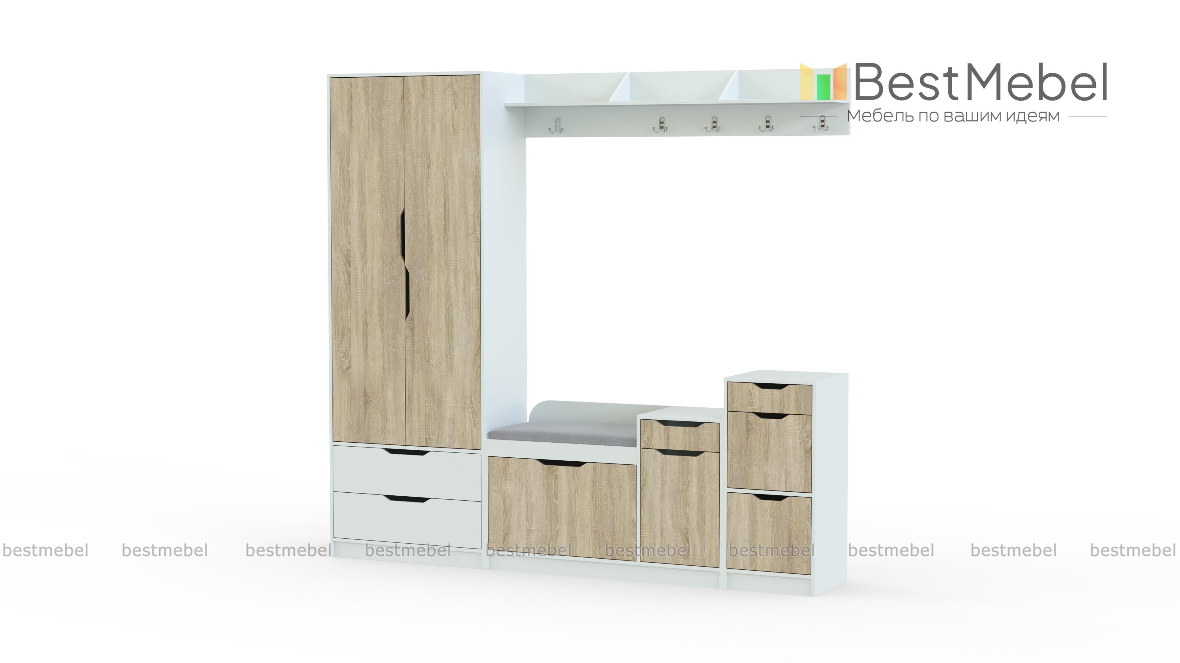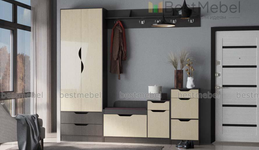 Прихожая Фаина-2 BMS предназначена для меблировки просторных помещений в современном стиле. Лаконичная и выполненная в контрастных тонах, модульная композиция отличается простым и эргономичным дизайном. В комплекте комбинированный шкаф с платяным отделением и выдвижными ящиками, обувница с мягким сиденьем, две тумбы, удобные для хранения аксессуаров и уходовых средств, и навесная вешалка с крючками и полкой под головные уборы. Комфортным и безопасным пользование сделают декоративные ручки-вырезы. Купить прихожую Фаина-2 BMS приглашаем в наш интернет-магазин по выгодной цене.