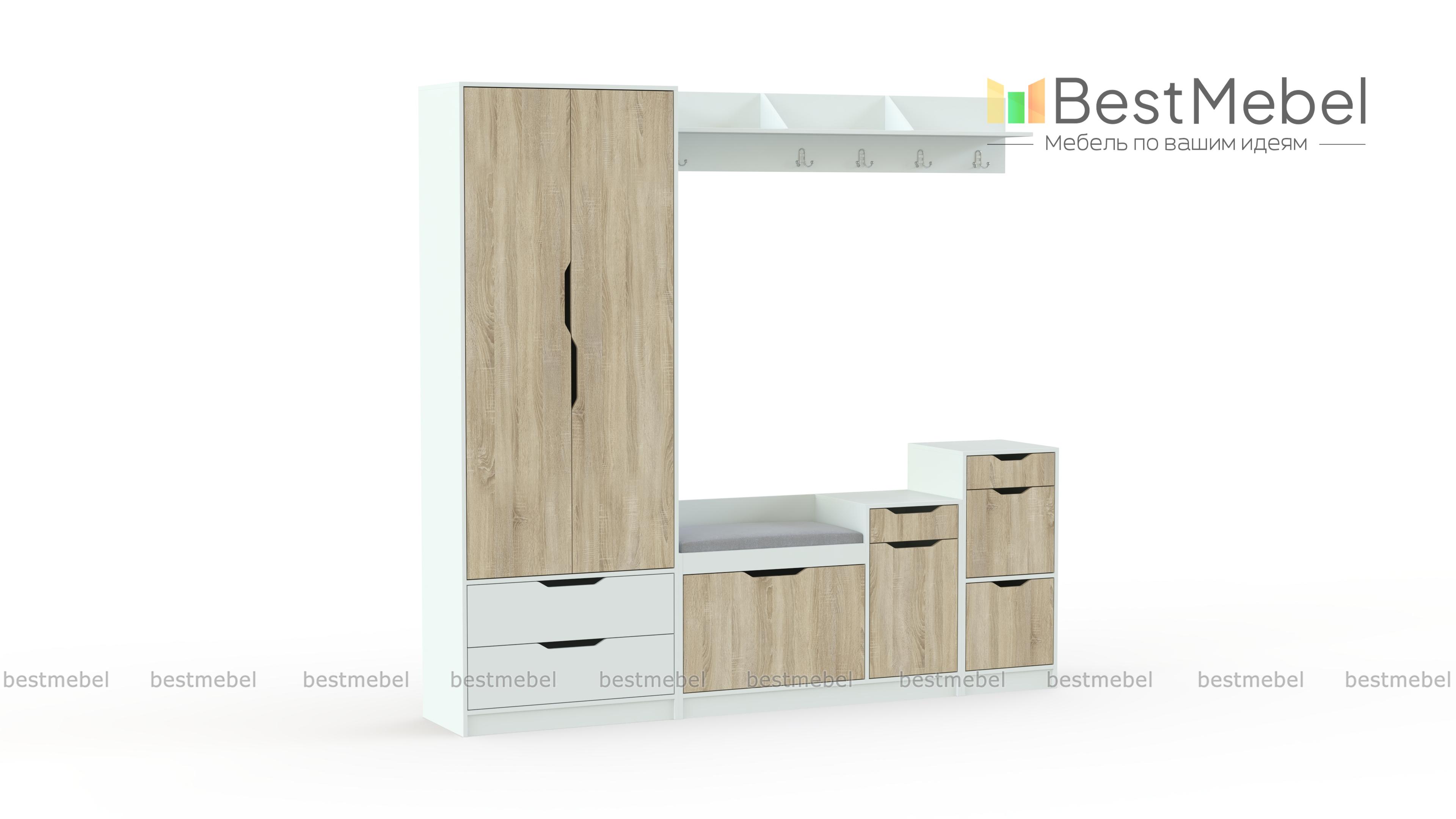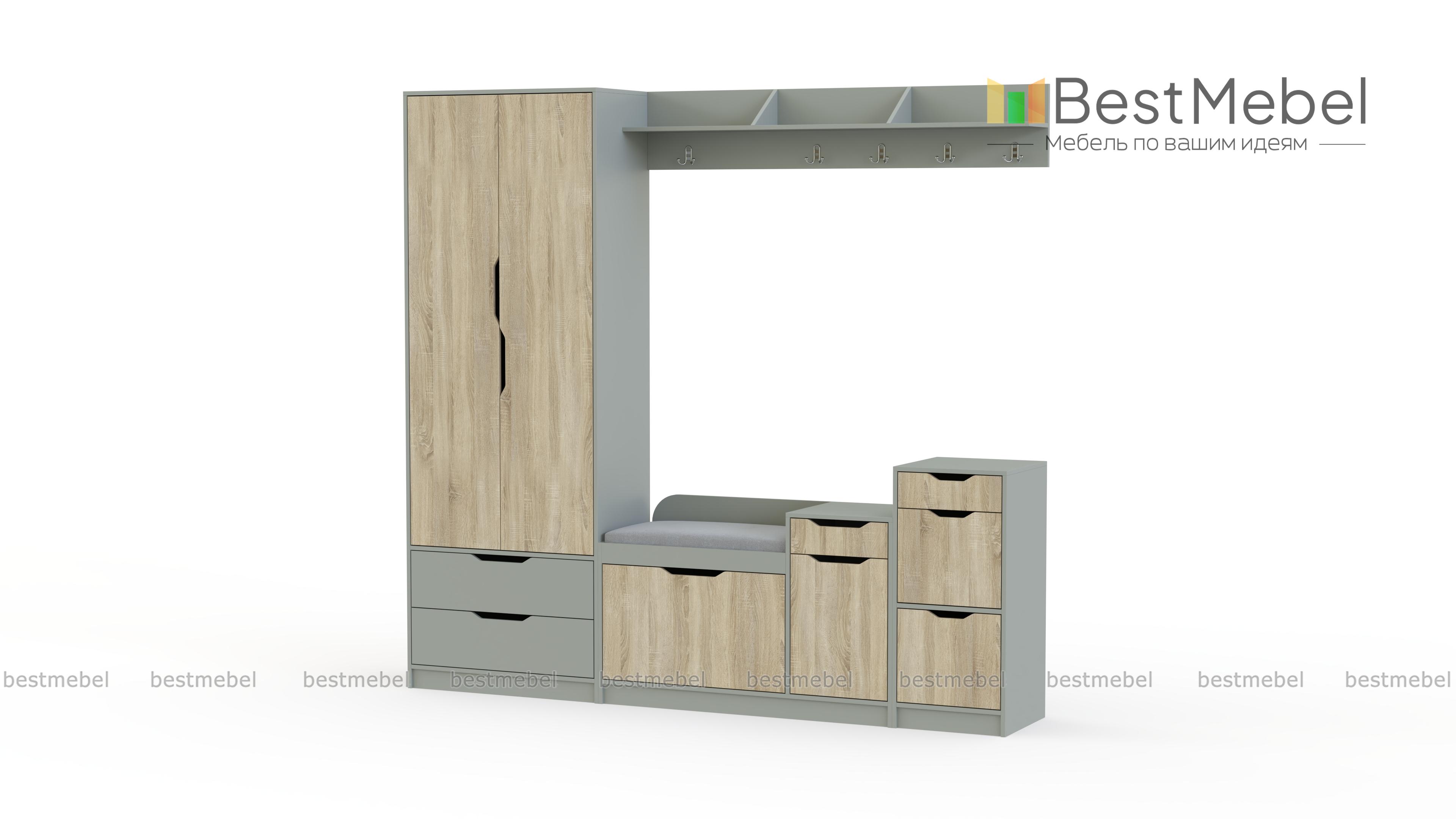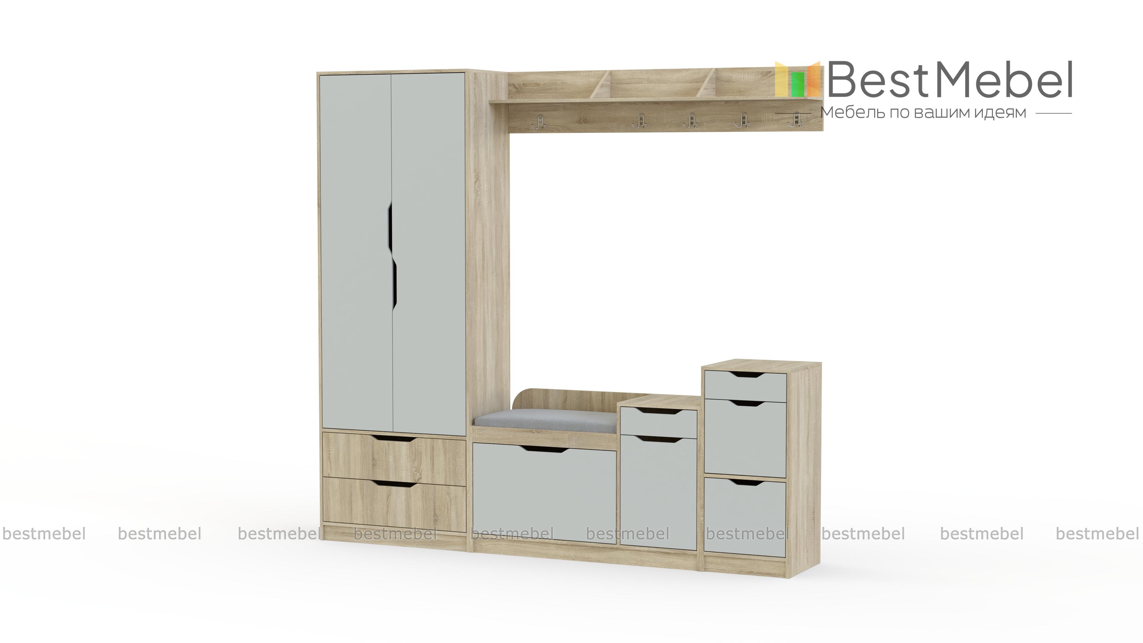 Прихожая Фаина-2 BMS предназначена для меблировки просторных помещений в современном стиле. Лаконичная и выполненная в контрастных тонах, модульная композиция отличается простым и эргономичным дизайном. В комплекте комбинированный шкаф с платяным отделением и выдвижными ящиками, обувница с мягким сиденьем, две тумбы, удобные для хранения аксессуаров и уходовых средств, и навесная вешалка с крючками и полкой под головные уборы. Комфортным и безопасным пользование сделают декоративные ручки-вырезы. Купить прихожую Фаина-2 BMS приглашаем в наш интернет-магазин по выгодной цене.