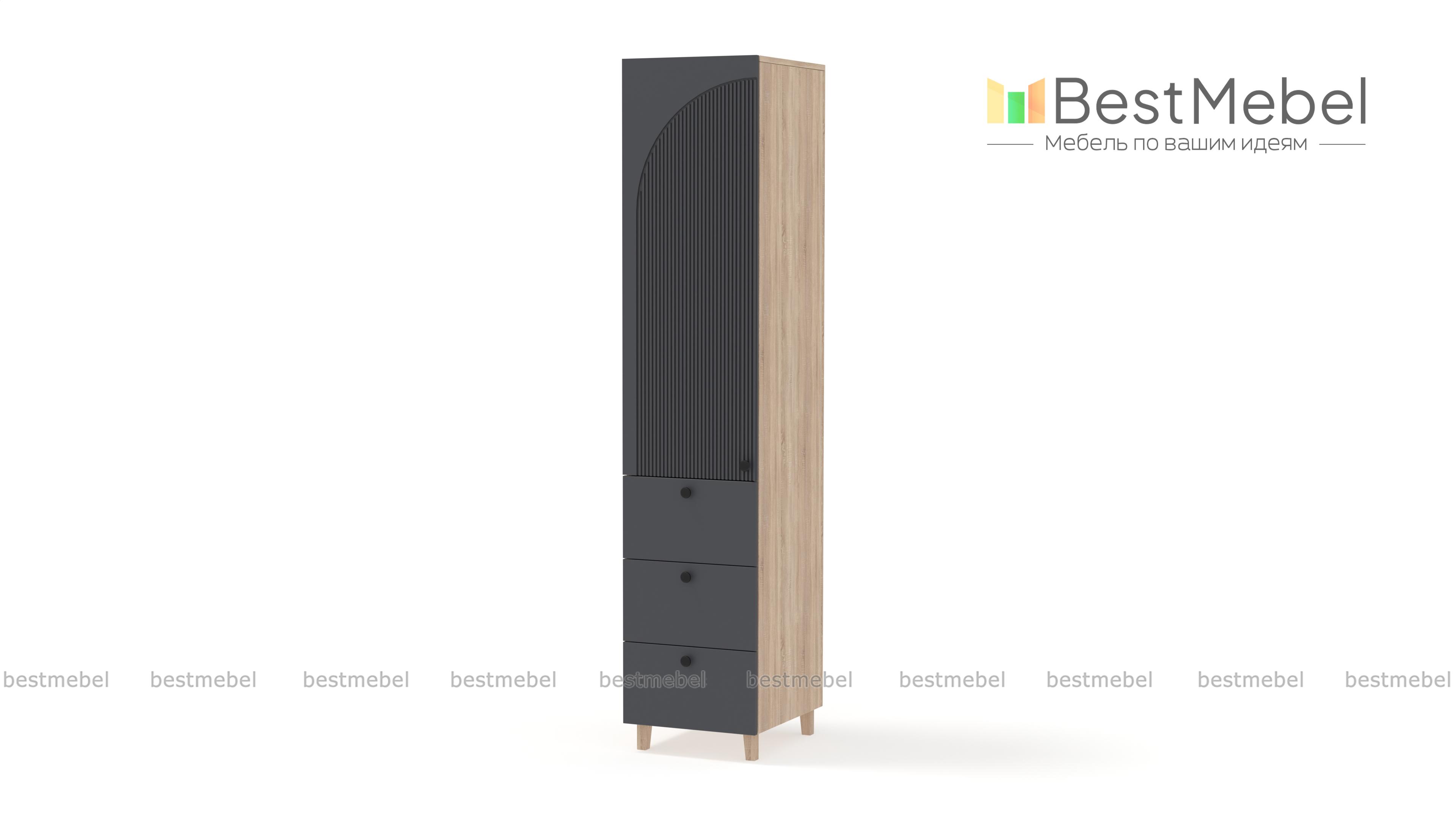 Шкаф-пенал Вивьен 1 BMS с опорами в стиле сканди универсален и отлично справляется с хранением одежды и текстиля для дома, учебных пособий, игрушек и кухонной утвари. Под распашной секцией с полками расположились три вместительных ящика с легким выдвижением. Покрытие корпуса и фасада отличается износостойкостью, а для декора использована стильная асимметричная фрезеровка. Купить шкаф-пенал Вивьен 1 BMS с выбором размеров, цвета и фурнитуры вы сможете недорого в нашем интернет-магазине.