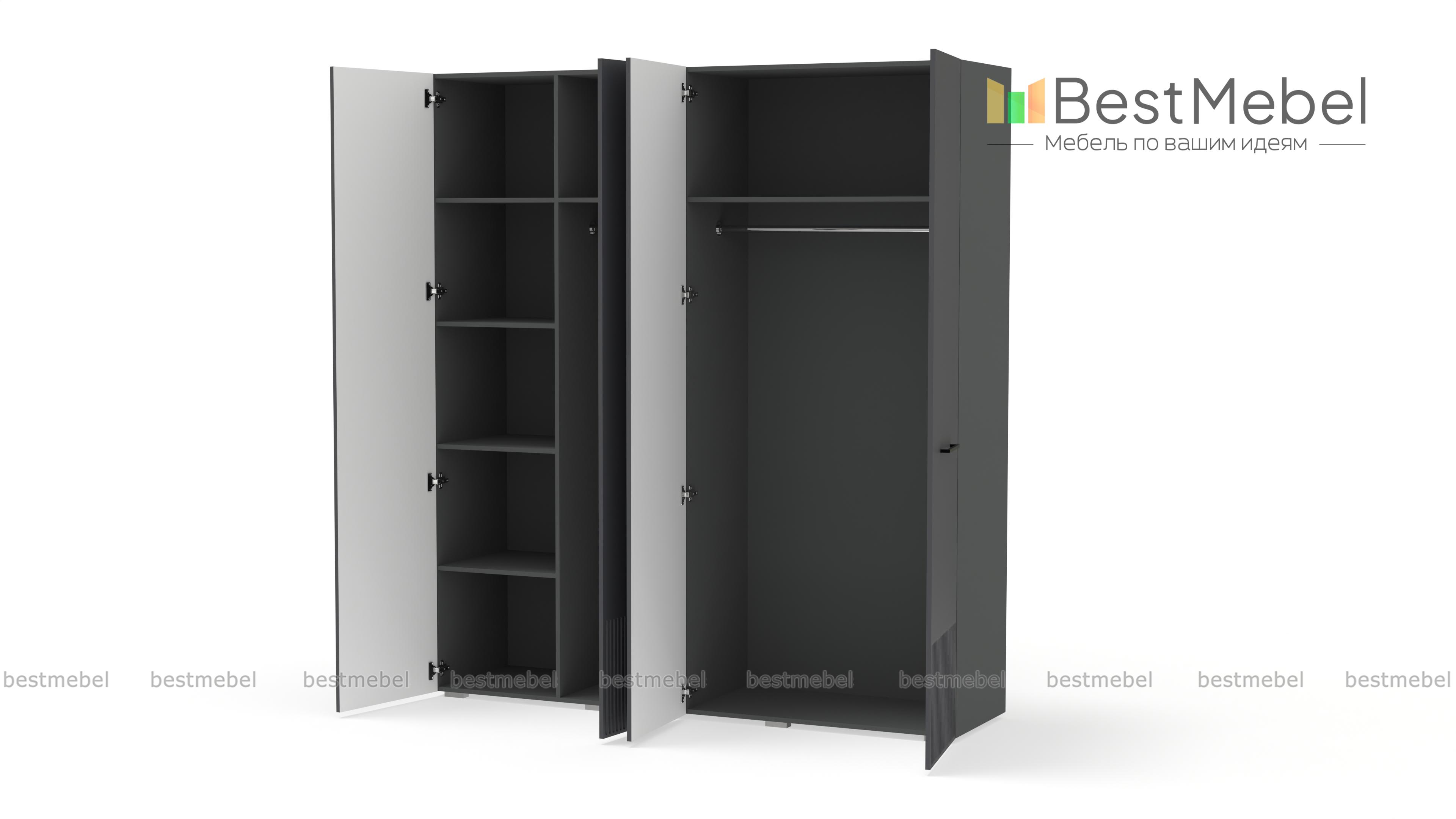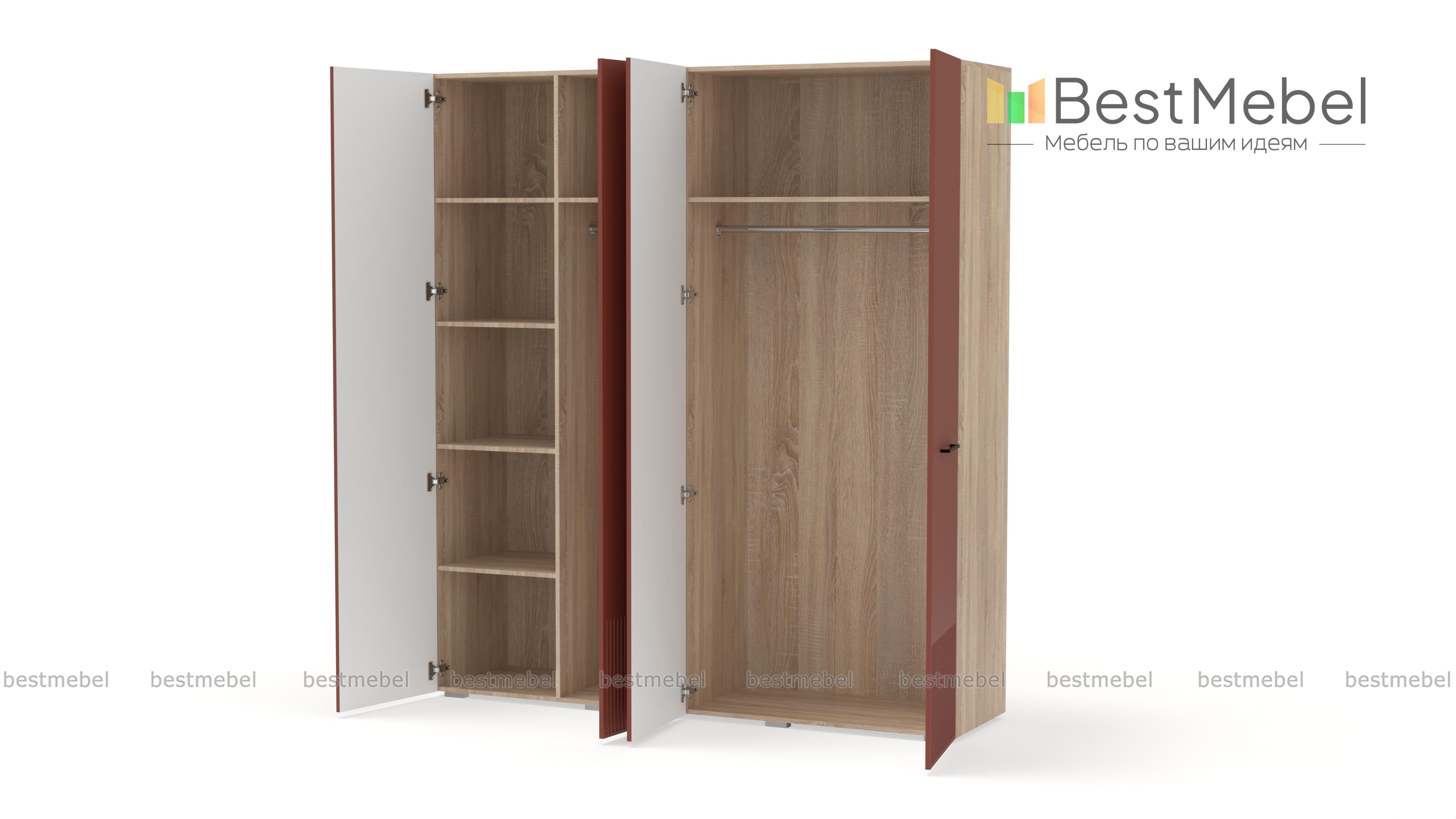 Шкаф распашной Декарт 4 BMS выполнен в традиционном стиле с поперечными контрастными ручками и фрезеровкой, что придает ему современный вид. Сочетание двух штанг разной длины и полок позволяет вам удобно организовать хранение одежды и коробок с обувью. Устойчивый к механическим повреждениям и влаге фасад из МДФ легко содержать в чистоте. Купить шкаф распашной Декарт 4 BMS с выбором размеров, цвета и наполнения вы всегда сможете в нашем интернет-магазине.