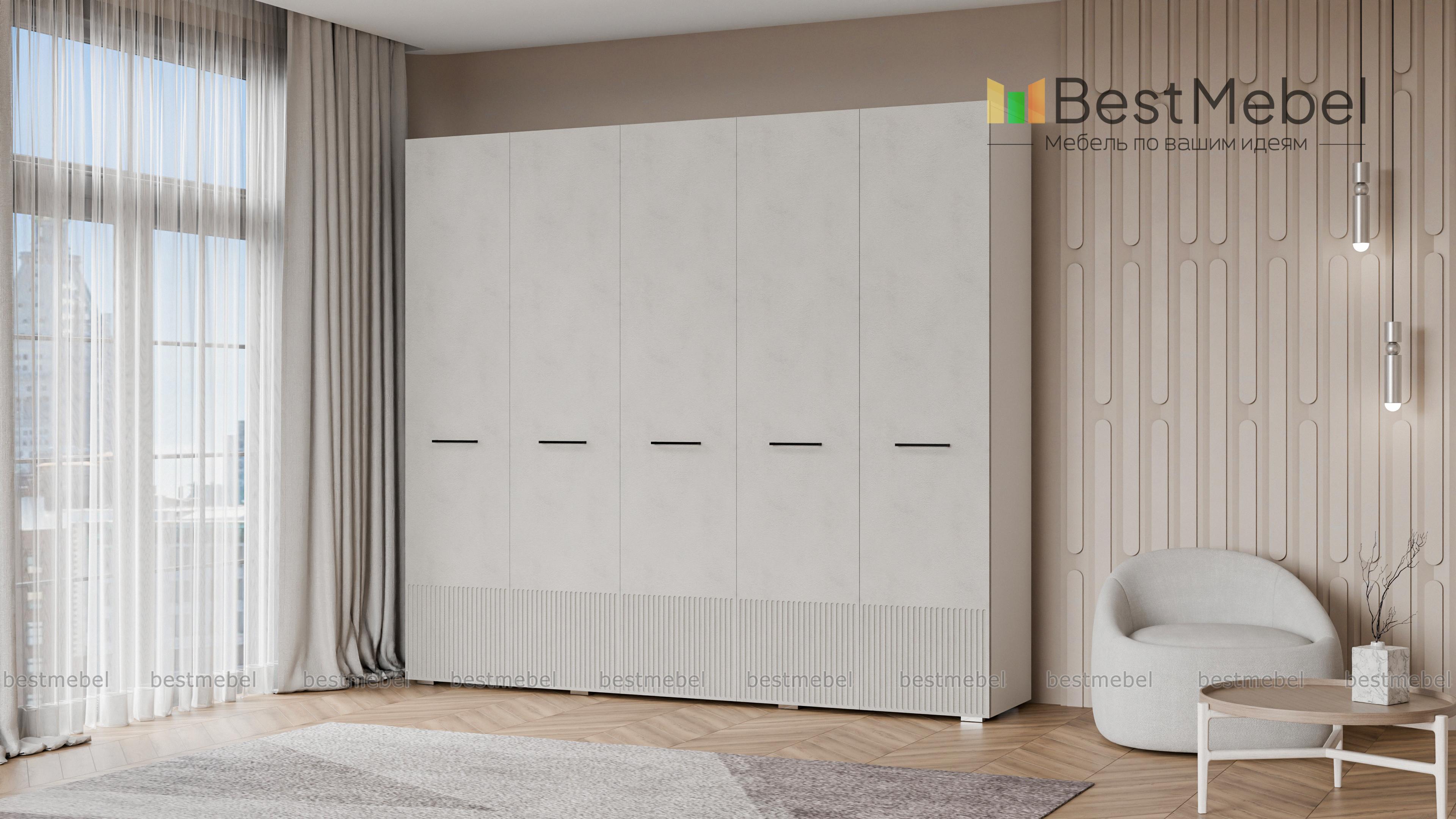 Шкаф распашной Декарт 5 BMS сочетает простую традиционную форму и актуальный дизайн. На сплошном светлом фасаде из МДФ выделяются поперечные ручки-скобы и фрезерованный рельеф, создавая визуально легкую конструкцию. Пятидверный гардероб позволяет организовать хранение с помощью пары штанг, вместительных верхних и бельевых полок. Купить шкаф распашной Декарт 5 BMS в удобном размере и любых оттенках из каталога вы сможете на сайте нашего интернет-магазина.