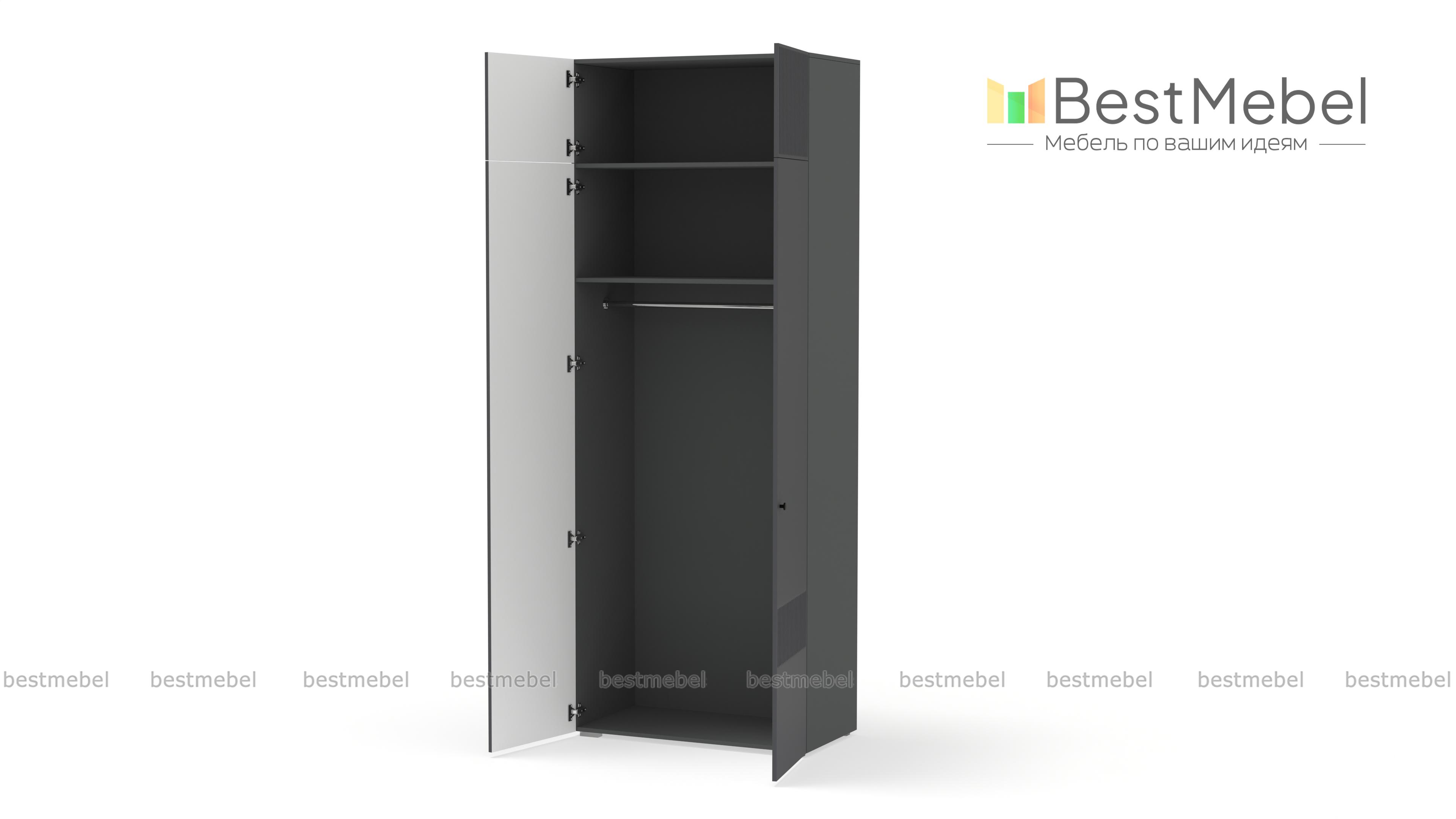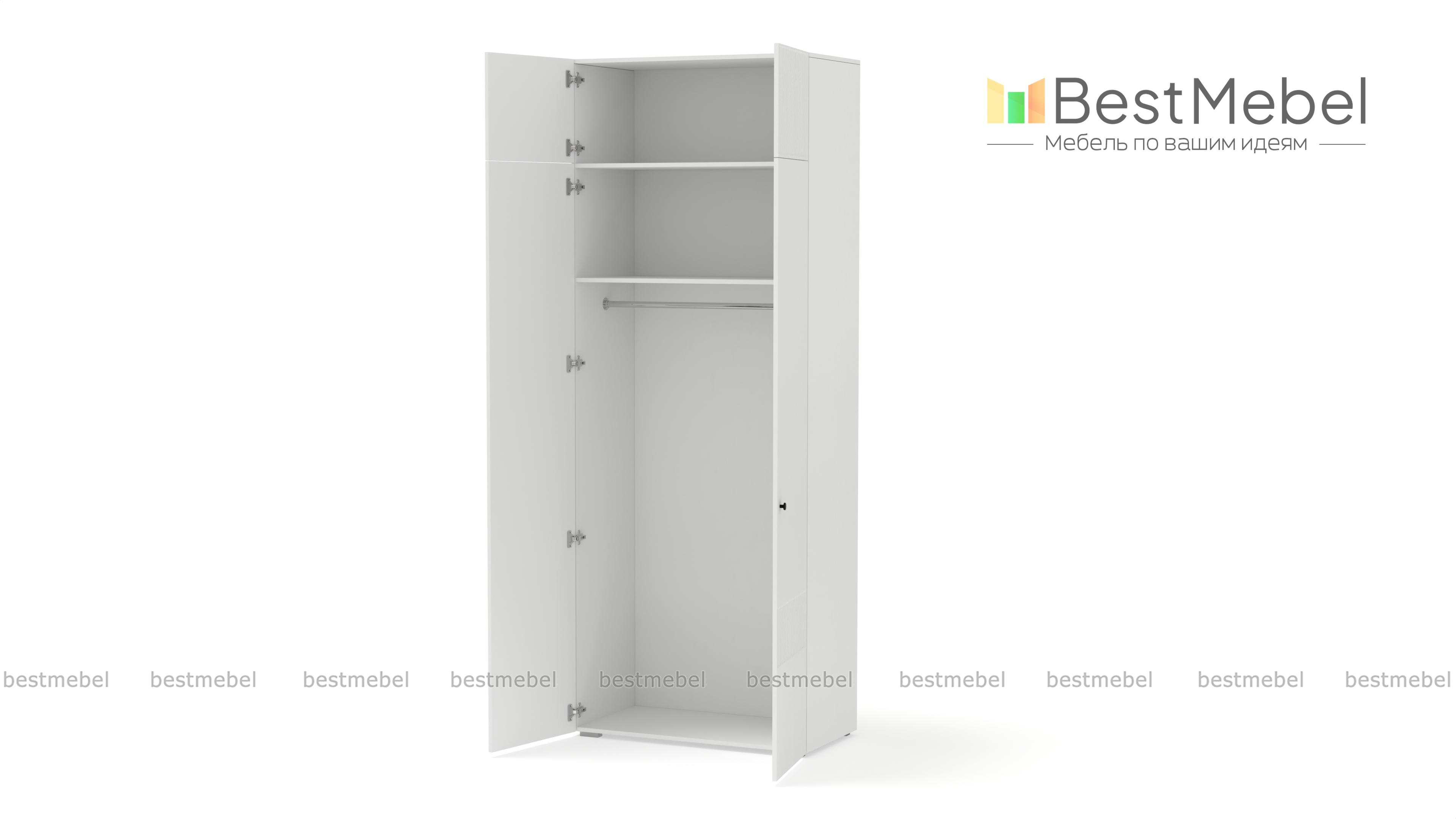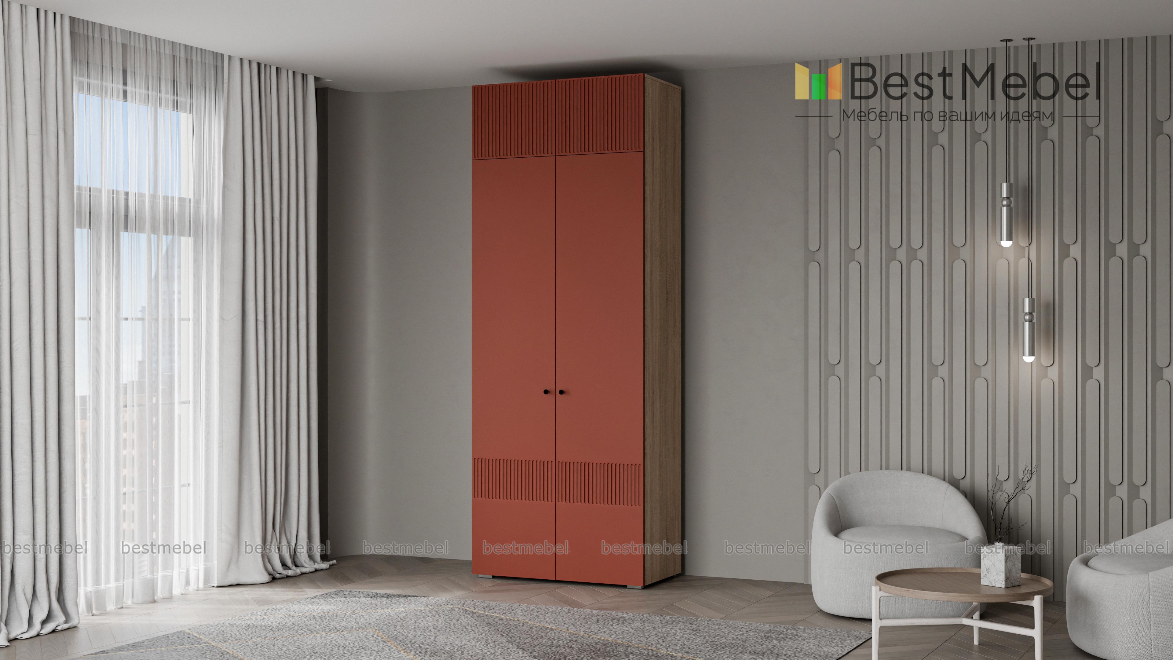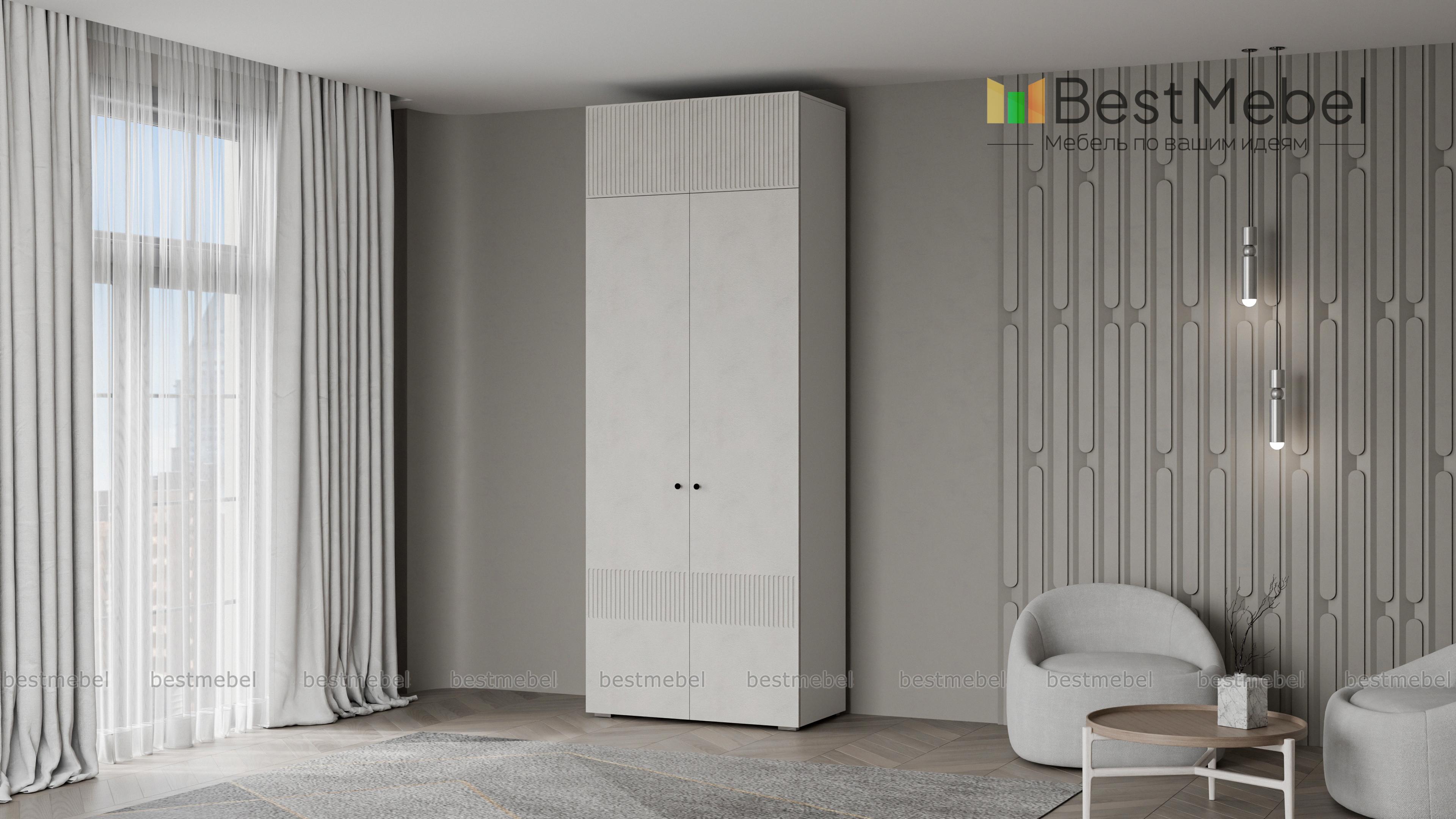 Шкаф распашной Джосс 8 BMS поможет эстетично организовать хранение, даже если пространство ограничено. За двумя дверцами, украшенными вертикальной фрезеровкой, — платяное отделение для одежды на вешалках и полка под коробки с аксессуарами. Дополнительный отсек сверху добавляет небольшому шкафу полезного объема, позволяя разместить сезонные или габаритные вещи. Купить шкаф распашной Джосс 8 BMS, изготовленный по индивидуальным размерам, вы сможете на сайте нашего интернет-магазина.
