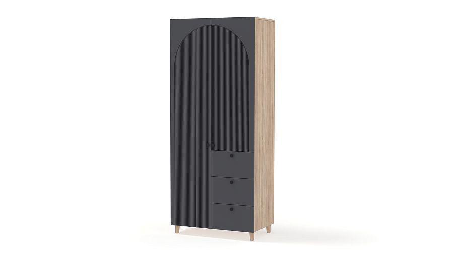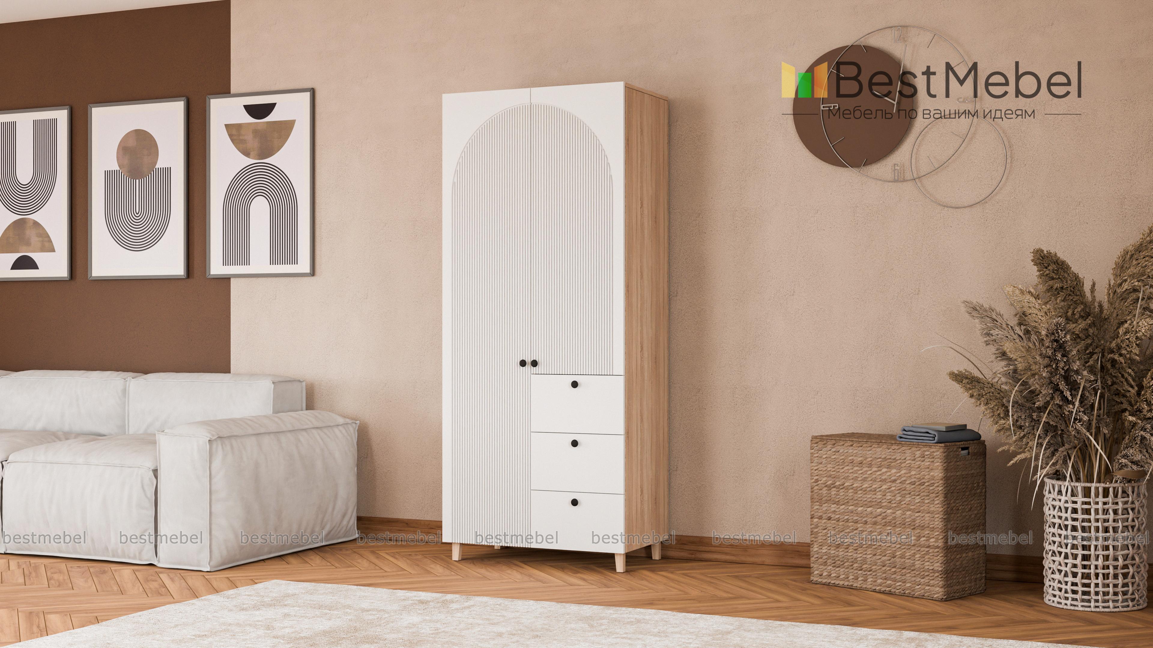 Шкаф распашной Вивьен 1 BMS — компактный, стильный и при этом функциональный. Удобно расположить базовый гардероб помогут распашные секции и ряд выдвижных ящиков, расположенных справа. В отделке шкафа с высокими ножками использованы универсальные оттенки, а роль акцента играют миниатюрные круглые ручки и оригинальный арочный рельеф на фасаде. Купить шкаф распашной Вивьен 1 BMS вы сможете на сайте нашего интернет-магазина в любом удобном размере и оттенках из каталога.