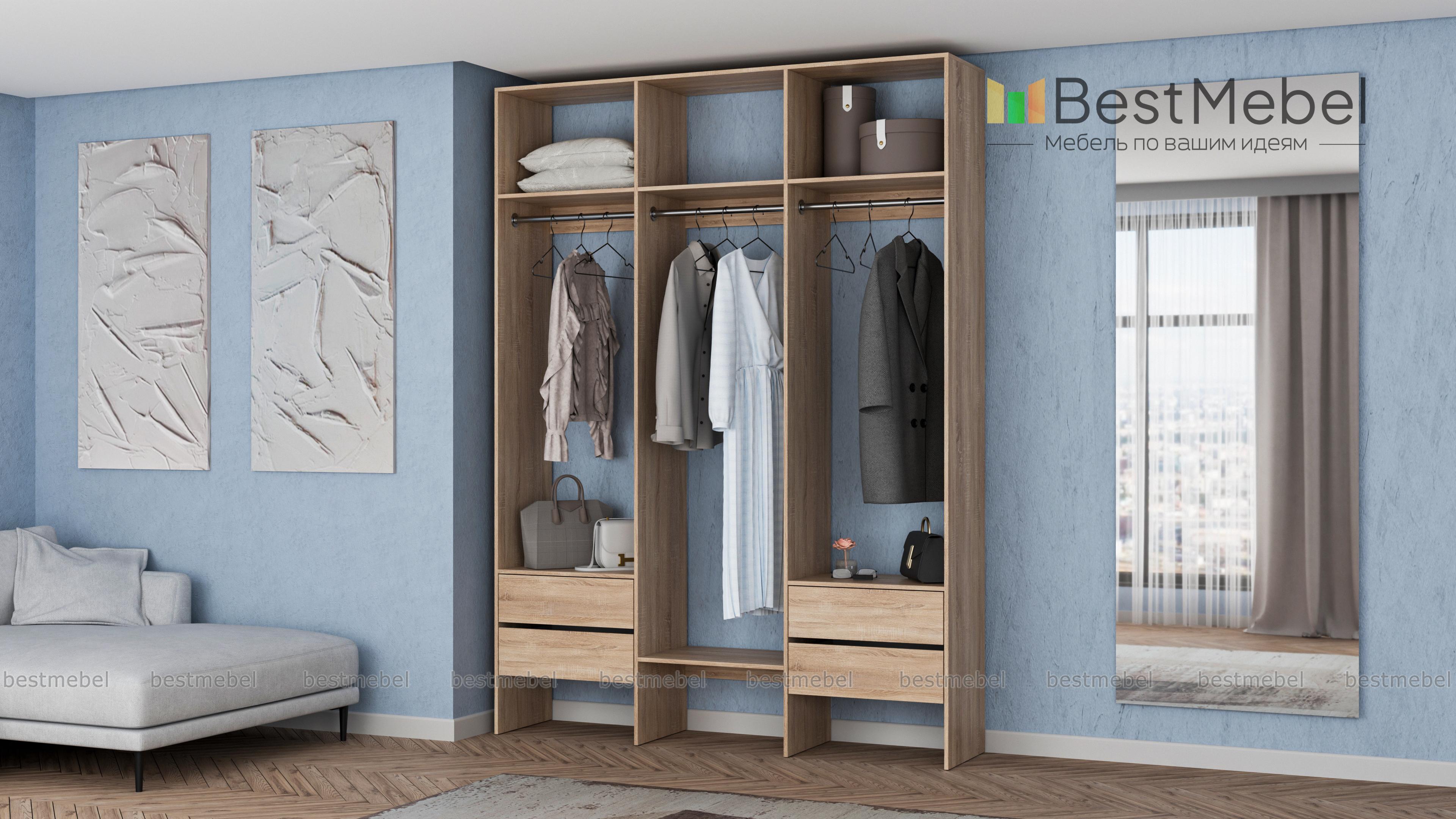 Стеллаж для одежды Мирта 58 BMS — это удобная база для вашей прихожей или гардеробной комнаты. Три перекладины позволяют разместить вешалки с короткой и длинной одеждой, для коробок и сложенных вещей предусмотрены полки, а для мелочей — две пары выдвижных ящиков. Лаконичное оформление и возможность выбора оттенка делают трехсекционный стеллаж практически универсальным. Купить стеллаж для одежды Мирта 58 BMS, изготовленный по вашим размерам, приглашаем в наш интернет-магазин.