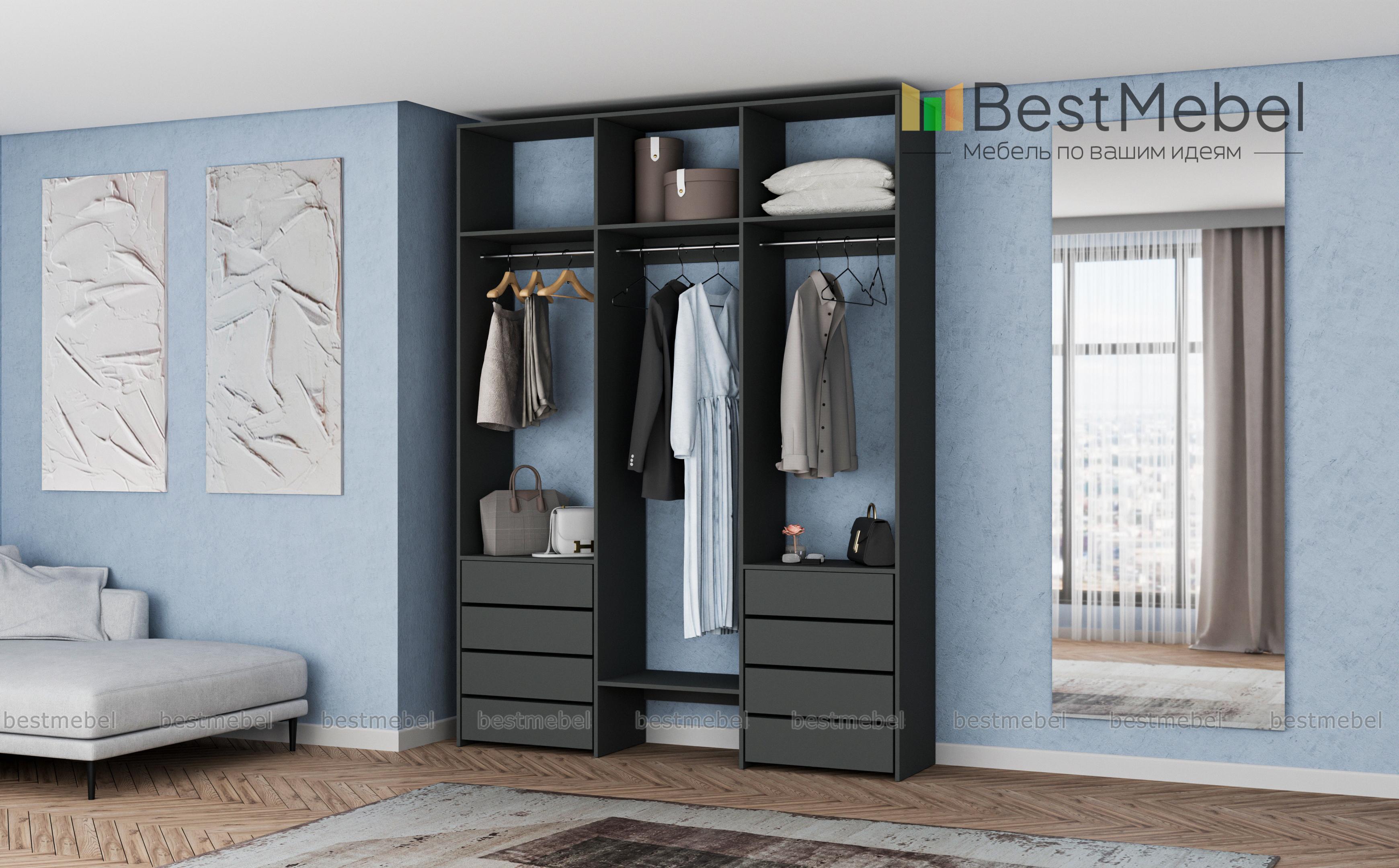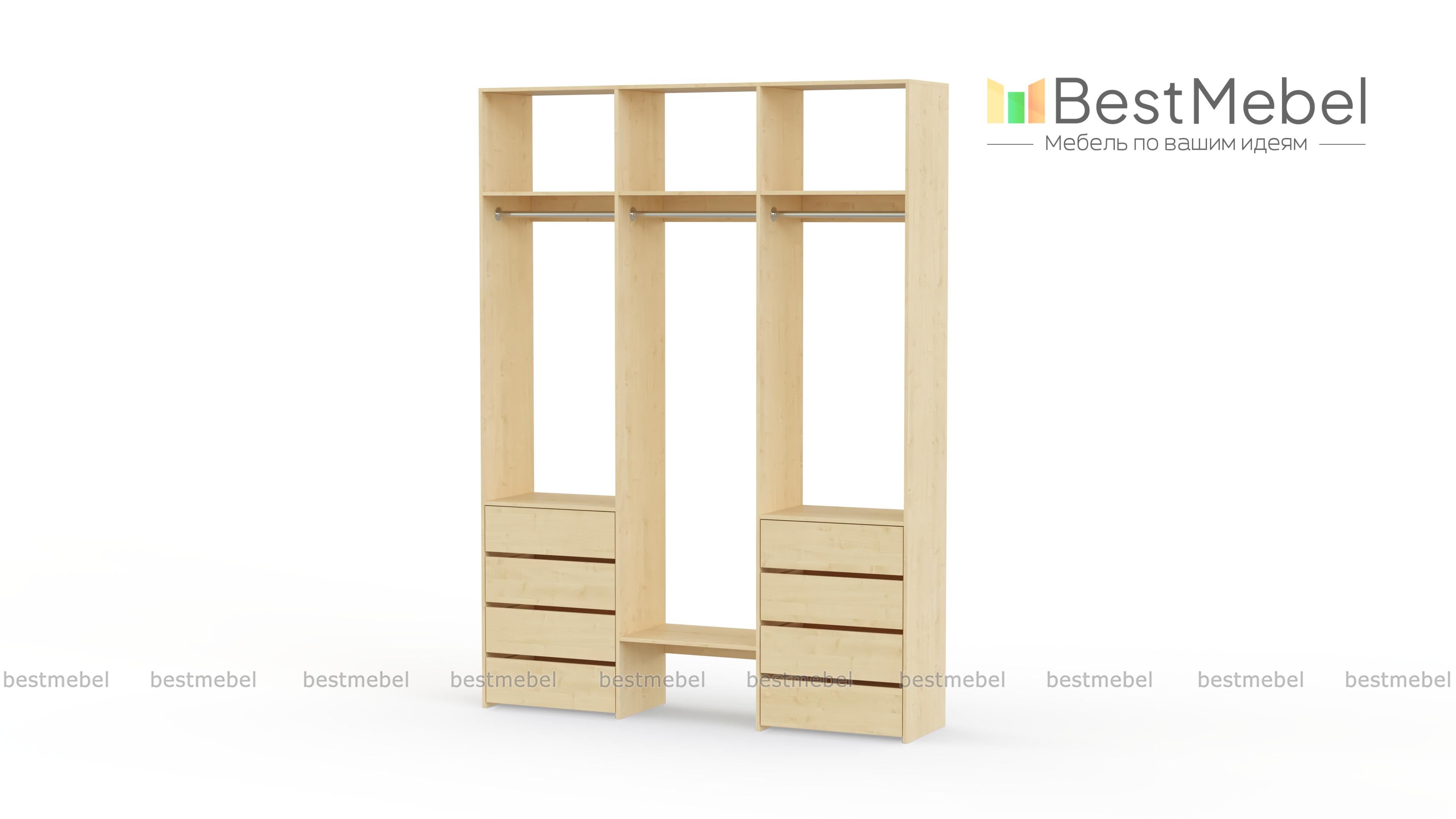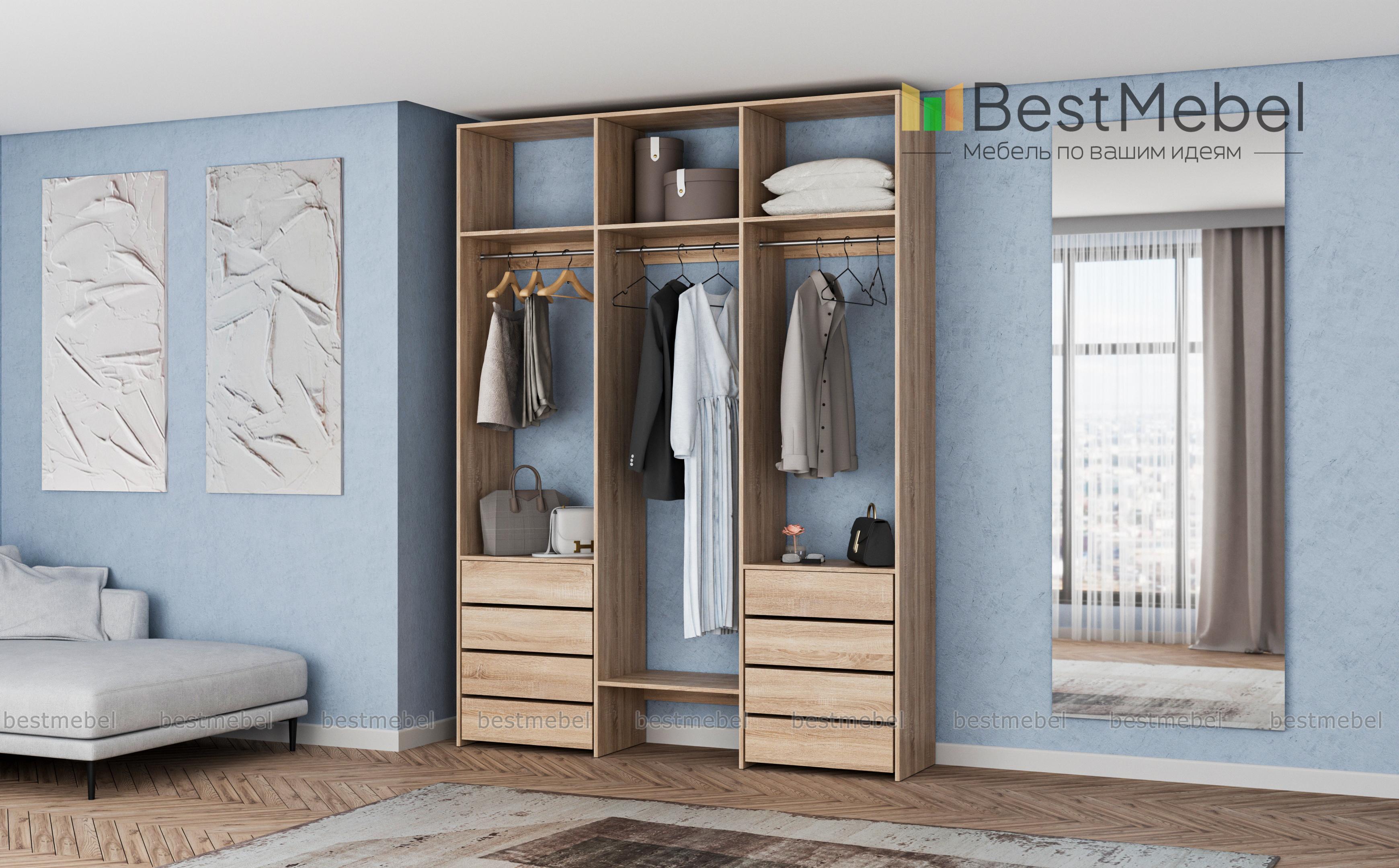 Стеллаж для одежды Мирта 9 BMS поможет вам хранить в порядке одежду, коробки с обувью и всевозможные аксессуары. Система хранения стеллажа включает в себя три вместительные полки сверху, три платяные штанги и восемь выдвижных ящиков, расположенных в два ряда. Прочная конструкция из ламинированной плиты прослужит долго, сохраняя эстетичный внешний вид. Купить стеллаж для одежды Мирта 9 BMS вы сможете в нашем интернет-магазине в удобном размере и любом оттенке из каталога.