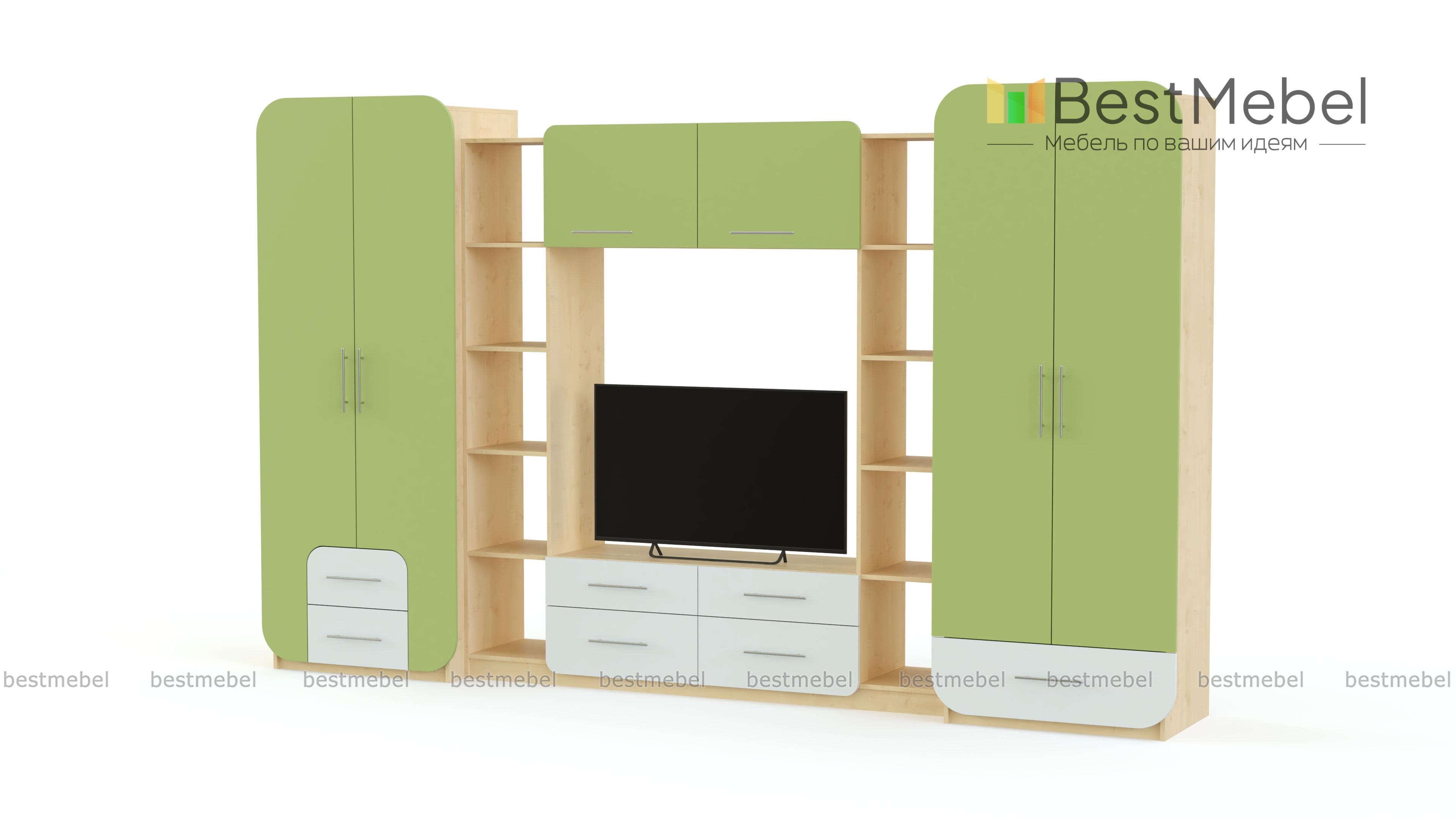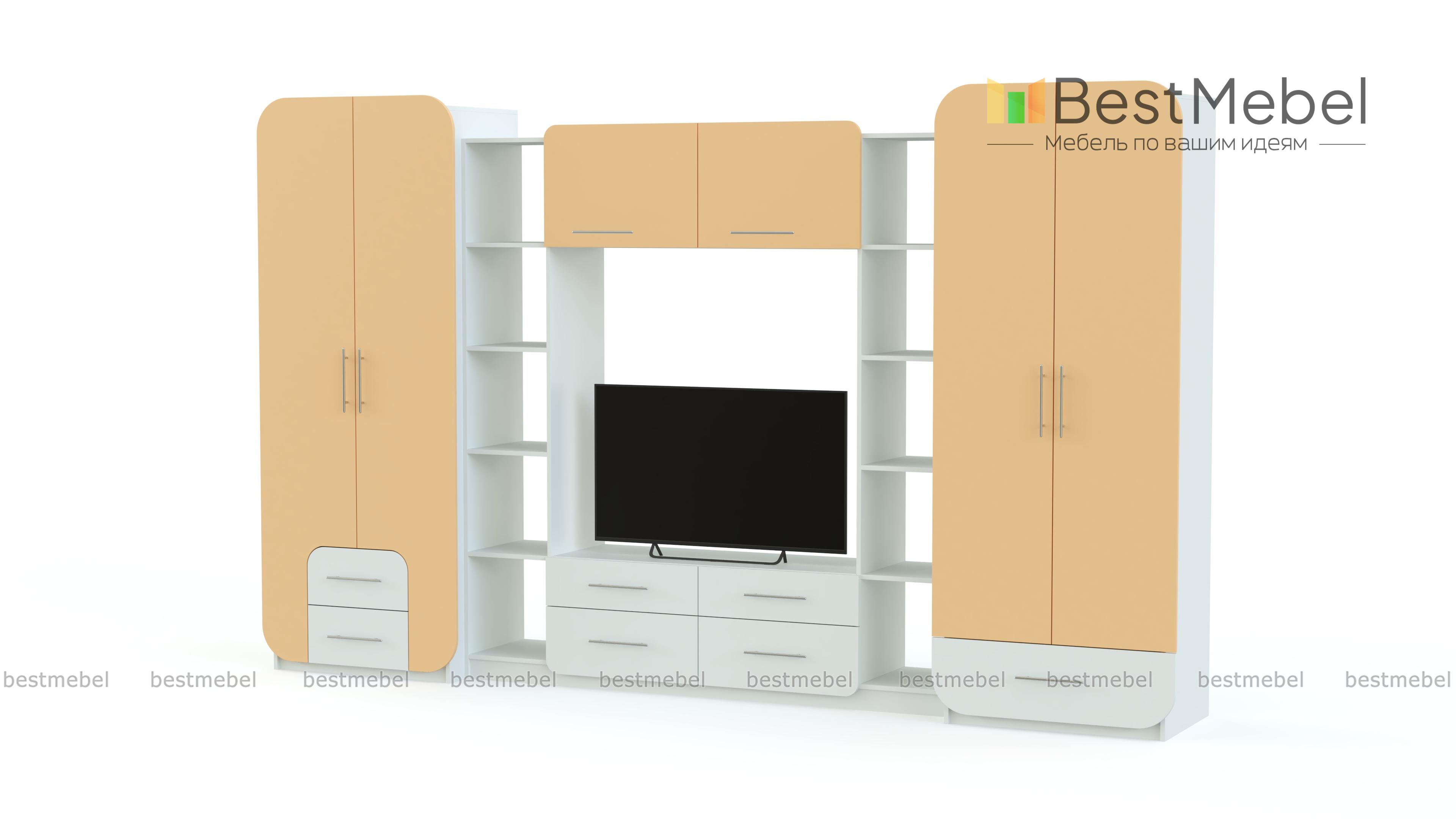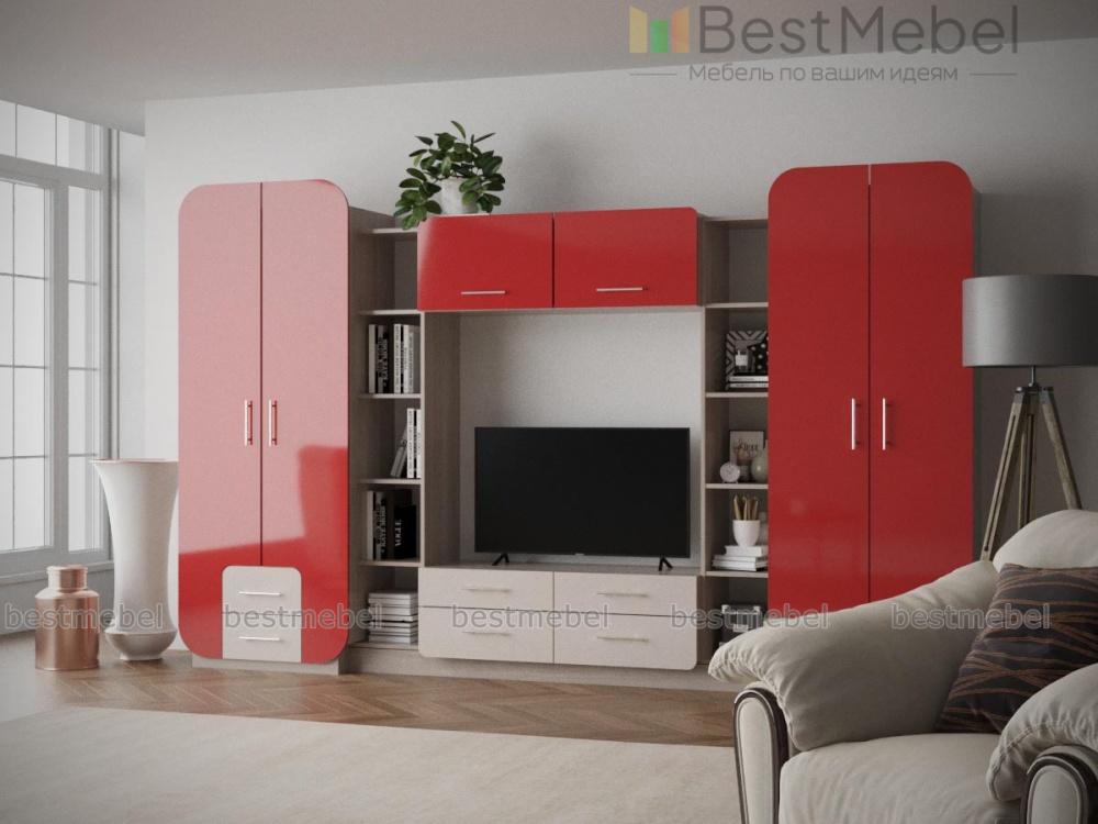 Необычное стилевое решение стенки Пенелопа-9 BMS сразу привлекает внимание. Эффектная и вместительная, она станет идеальным решением для гостиной или студии. Модель оборудована платяным и бельевым шкафами, стеллажами с открытыми полками, тумбой под ТВ с выдвижными ящиками и навесной верхней секцией. Скругленные углы шкафов и центральной композиции придают стенке завершенный вид, а яркие матовые фасады поднимут настроение хозяевам и гостям дома.