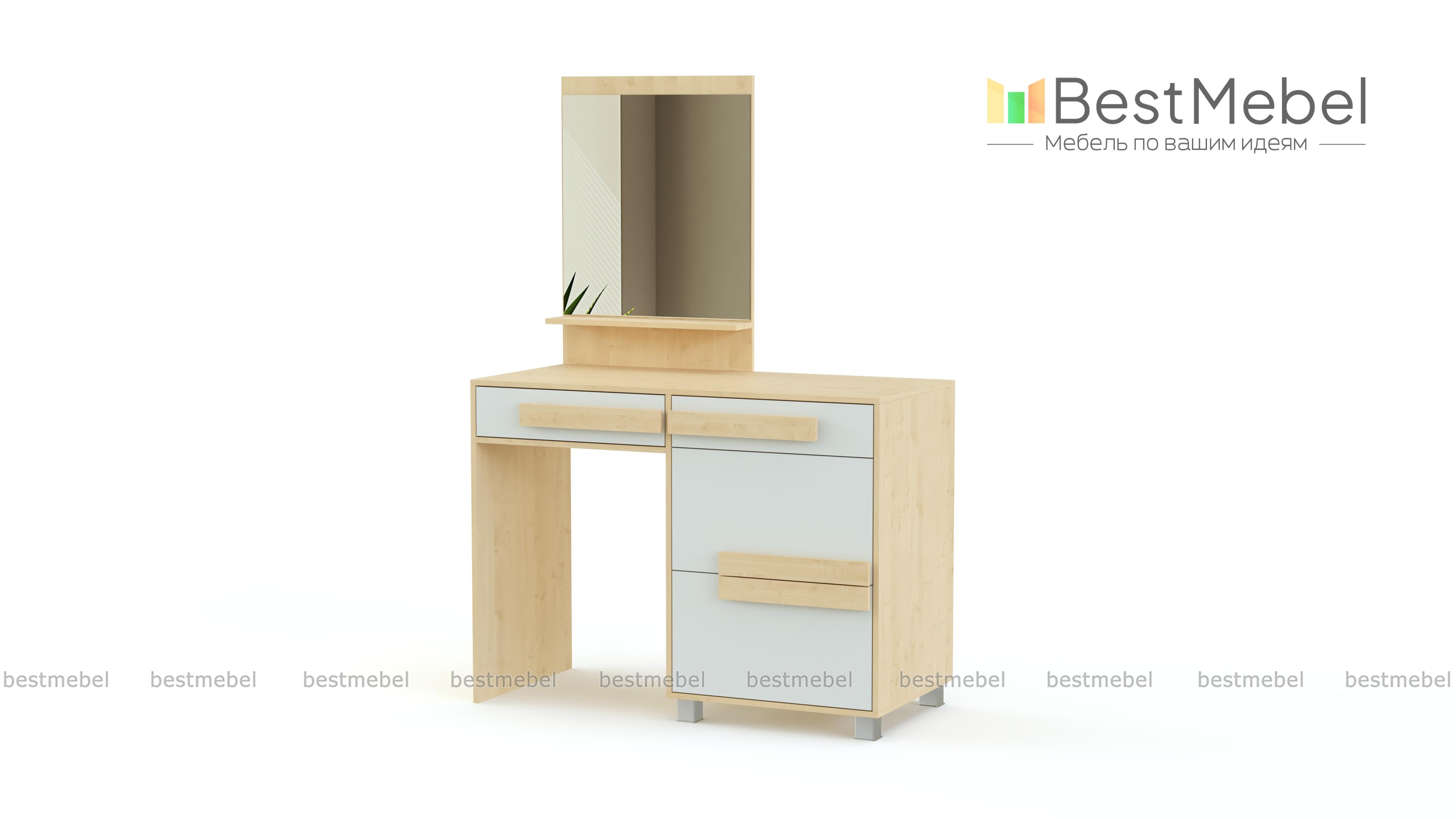 Туалетный столик СТ-5 Арт 155 BMS – стильный предмет интерьера для современной спальни. Закрепленное на столешнице зеркало дополнено узкой полочкой для мелочей. Также модель оснащена выдвижным ящиком и боковой тумбой для хранения уходовых средств и бумаг. Интересно смотрится этот простой функциональный столик за счет необычной отделки фасадов, модной цветовой гаммы и высоких ножек тумбы. Доступный по цене, туалетный столик СТ-5 Арт 155 BMS будет отличным приобретением для дополнения спального гарнитура или установки в прихожей.